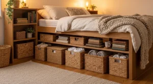 Storage doesn’t have to look boring. Woven baskets or fabric bins can keep things tidy while still fitting the aesthetic. Slide them under the bed or place them on shelves. They hide clutter but still look intentional. Choose colors that match the room’s palette so everything feels cohesive. When things are organized, the room naturally feels more peaceful. It’s one of those behind-the-scenes details that quietly improves the entire space.