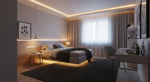 LED strip lights add a modern touch while still feeling cozy if you choose warm tones. Place them under the bed frame, behind shelves, or along the ceiling edges. Avoid harsh colors if the goal is comfort. Soft amber or warm white works best. At night, it creates a gentle glow that feels subtle but noticeable. It’s especially great for winding down before sleep. The room suddenly feels more layered, like there are different lighting moods instead of just one bright overhead light.